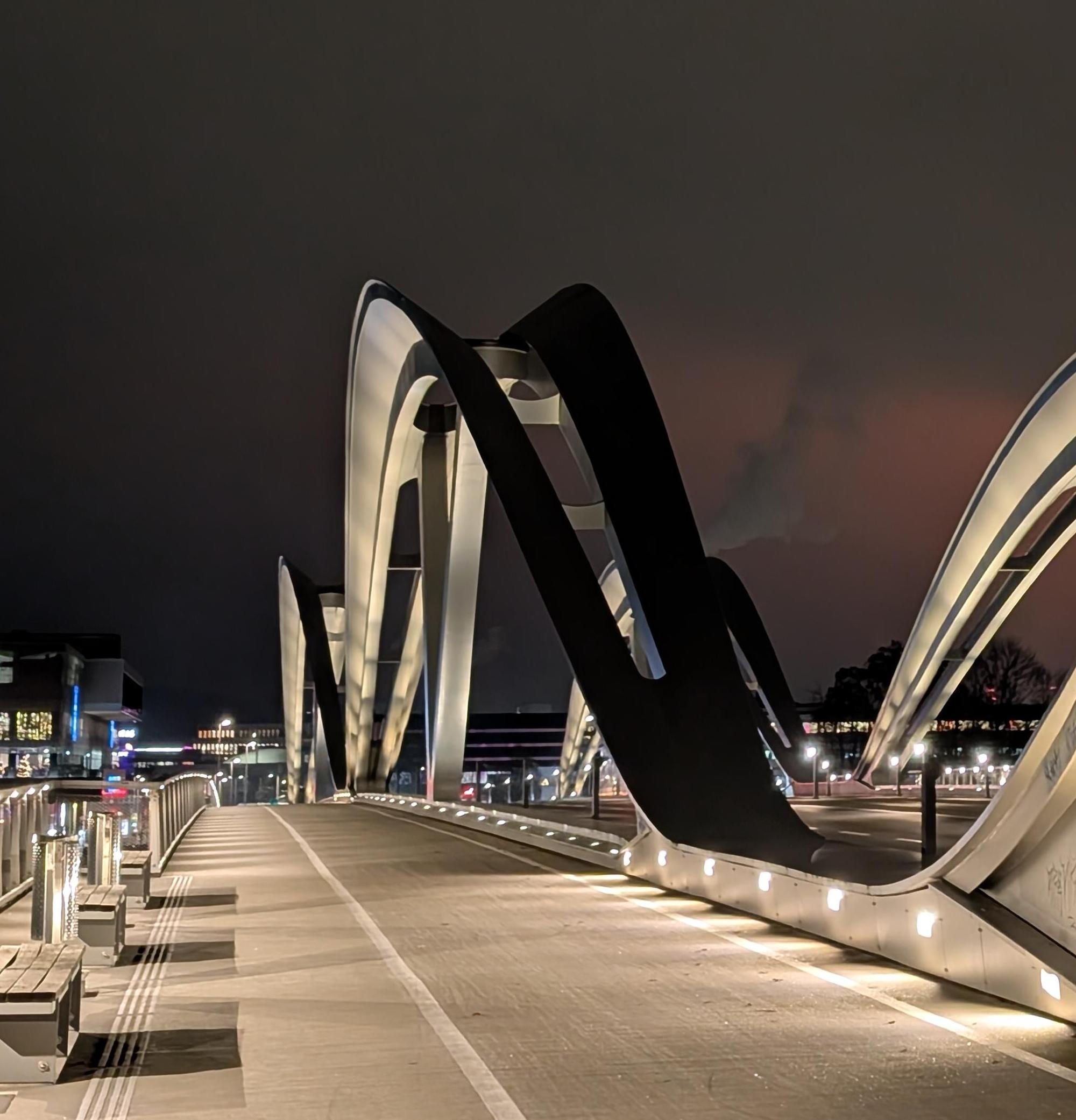 Trek: AEC zur Eisenbahnbrücke, entlang dem Donauuferweg über die Donau und auf der anderen Seite zurück: Ars Electronica Center, Urfahraner Markt, Eisenbahnbrücke, Brucknerhaus, Lentos Kunstmuseum